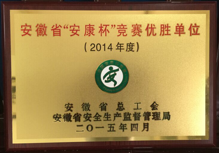 日前,在安徽省總工會和安徽省安全生產監督管理局組織開展的以“廣泛發動提質量,文化引領強基礎”為主題的“安康杯”競賽活動評比中,我公司被授予2014年度安徽省“安康杯”競賽先進單位光榮稱號。