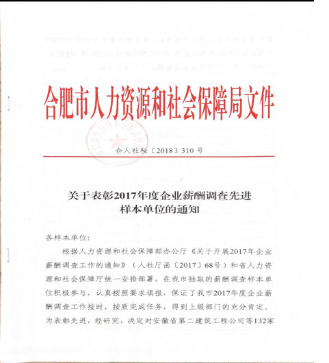 根據人力資源和社會保障部辦公廳《關于開展2017年度企業薪酬調查先進樣本單位的通知》(人社廳函【2017】68號),我公司領導高度重視,按照通知要求精心組織安排人員,以快速高效嚴謹的工作態度,圓滿完成了此次企業薪酬調查工作,得到了上級部門的充分肯定,榮獲了“2017年度企業薪酬調查先進樣本單位”殊榮。