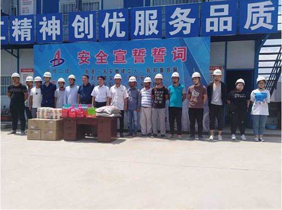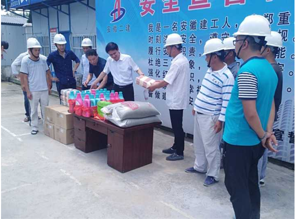 721日上午,驕陽似火,酷暑難當,集團公司工會副主席吳曉伍在公司工會主席李林的陪同下,不畏酷暑來到岳西潤業電商產業園開展“送清涼”活動,為奮戰在一線的員工和廣大農民工送去了絲絲涼意,獻上了一份誠摯的關懷。項目經理季風帶領項目部全體成員迎接集團和公司領導并領取了集團公司為職工發放的防暑藥品、礦泉水、綠豆、毛巾、洗衣液等防暑降溫物品。