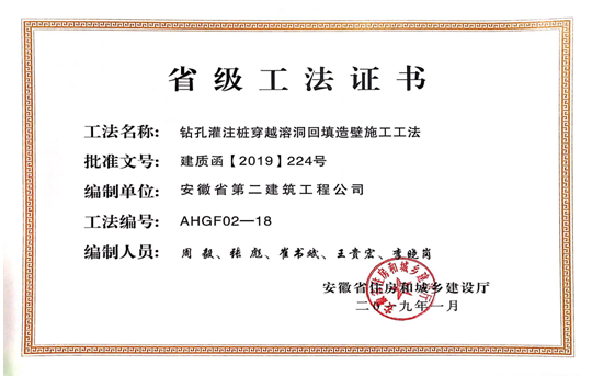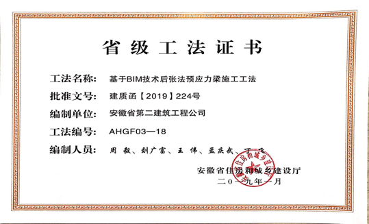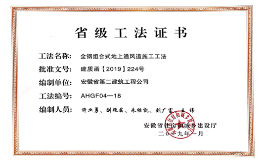 1月23日,安徽省住房和城鄉建設廳組織省級工法評審委員會,對企業申報的277項工法進行了評審并予以公示。經審定,“預應力型鋼裝配式組合內支撐施工工法”等103項工法為安徽省2018年度省級工法。由公司編寫的《鉆孔灌注樁穿越溶洞回填造壁施工工法》、《基于BIM技術后張法預應力梁施工工法》、《全鋼組合式地上通風系統施工工法》3項工法被評為省級工法。