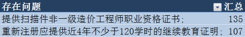 通過分析不符合條件人員的問題發(fā)現,存在“提供掃描件非一級造價工程師職業(yè)資格證書”、“重新注冊應提供近4年不少于120學時的繼續(xù)教育證明”這兩大問題的人員較多,分別為135人和107人,占所有不符合初始注冊條件人數的49.2%。