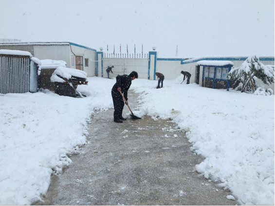 近日,阿爾及利亞康斯坦丁接連下了幾場(chǎng)大雪,雪花翩躚飛舞,康斯坦丁大地一片銀裝素裹。為了防止路面結(jié)冰,方便人員出行,1月19日早晨,在項(xiàng)目部經(jīng)理章恒旭的帶領(lǐng)下,康斯坦丁6000套項(xiàng)目部全體管理人員頂風(fēng)冒雪、齊心協(xié)力上路清理項(xiàng)目部院內(nèi)及道路積雪。